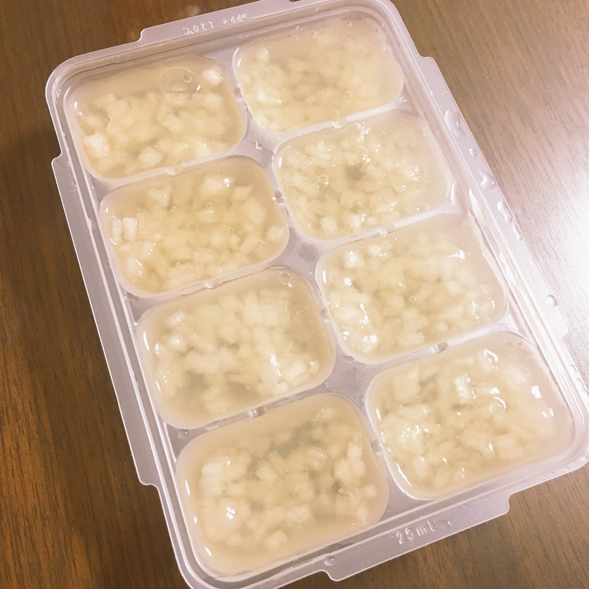 Chihiro 梨とりんごの寒天ゼリー 離乳食11ヶ月児用 リッチェルのわけわけフリージング25ml2つ分 鍋にりんごジュース100mlと水0ml 粉寒天2gを入れて火にかけ 約2分煮溶かす 梨を小さく刻んでトレーに入れ そこに寒天液を流し入れ 粗熱が取れ